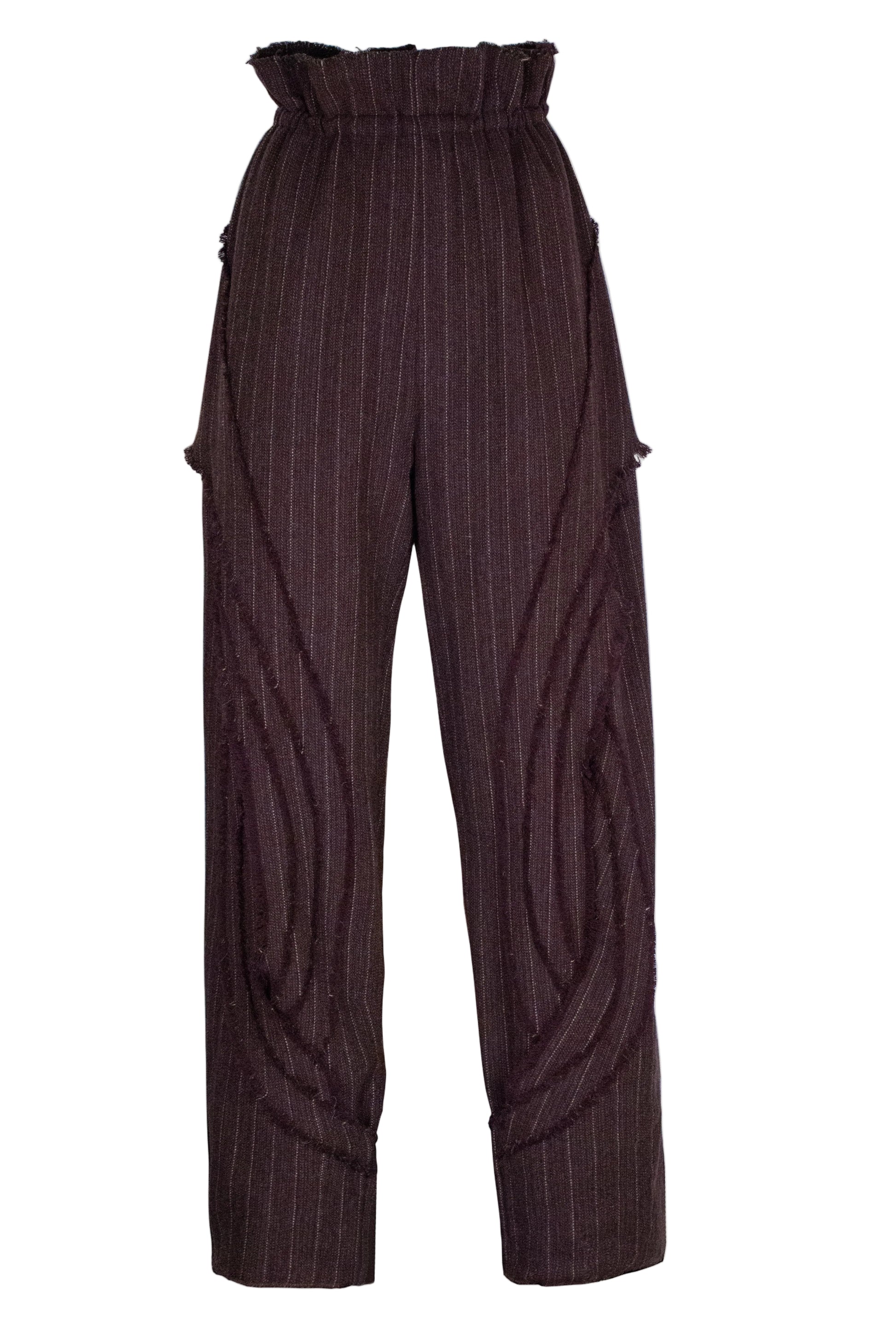 These voluminous, wide-leg trousers fall freely, crafted from melange plum-coffee wool with a subtle pinstripe.