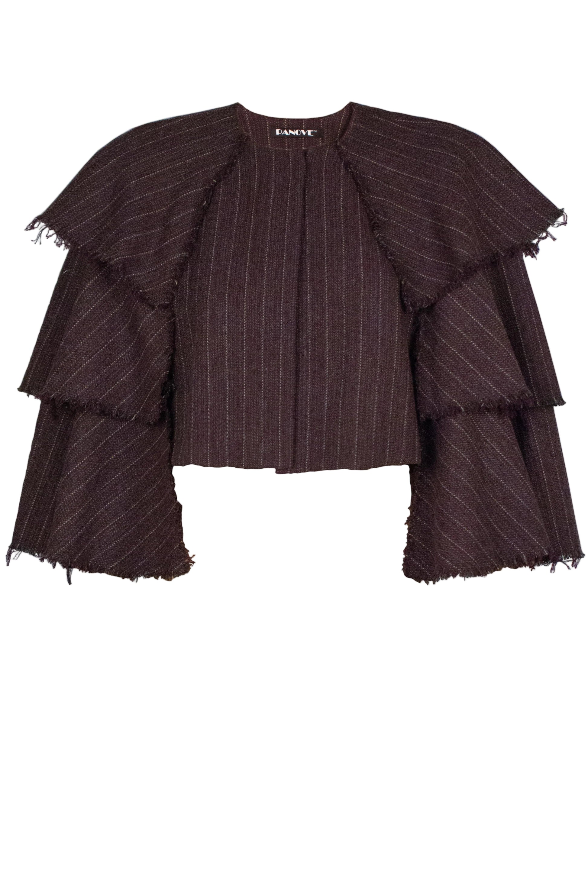 This cape is crafted from soft melange wool with a subtle pinstripe pattern. The design features a cropped silhouette.